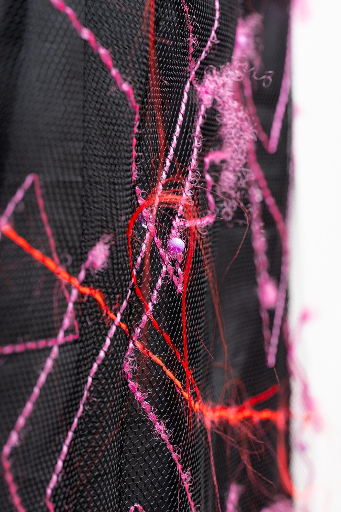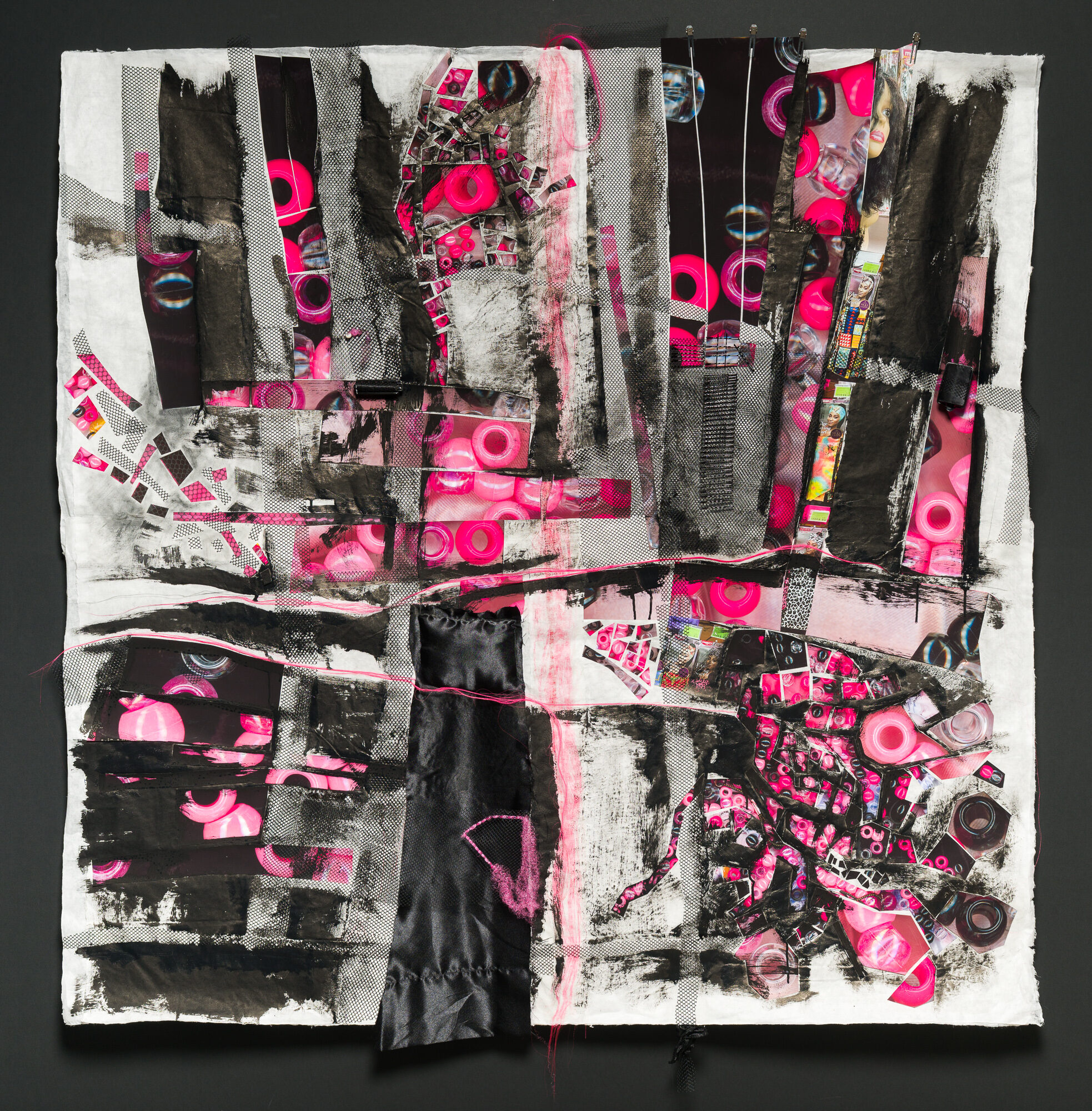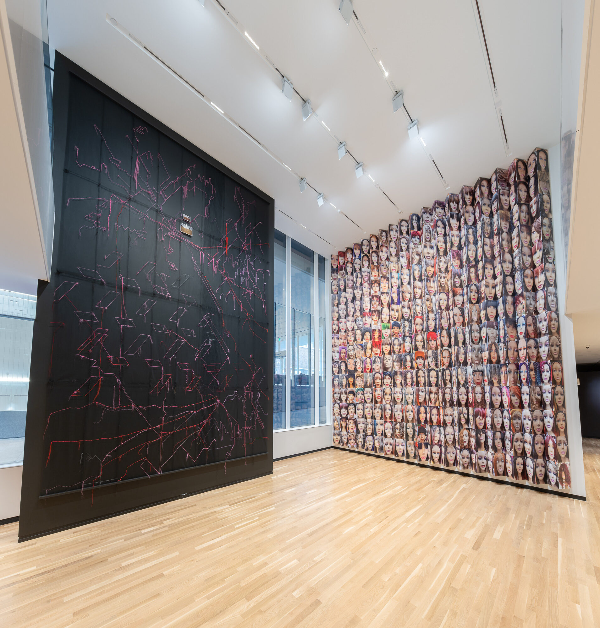The exhibition features two installation pieces that each stretch 22 feet tall, along with several mixed-media works hung around the gallery space. One of the larger pieces, Migration Studies, Beauty Supply (No. 111, Taproot: The direction of the rain.), is an entire wall made from weaving net that Jarrett installed in the space while perched on a scissor lift. She hand-wove synthetic hair throughout the substrate of the net, which was her “line work, as in drawing,” she says. The other, 503 portraits of wig mannequins and 1 portrait of Diana Ross (Beauty and Beyond), is a collage Jarrett created from photographs she’s taken at beauty supply stores across the country (with a portrait of Diana Ross snuck in amid them). While most visitors thought that the photos were of Barbie dolls, a group of fourth- and fifth-grade girls from the King School Museum of Contemporary Art (a museum inside of a public school, co-founded by Jarrett) immediately recognized the references to a beauty-supply store. The mannequin heads with wigs and synthetic hair were “such familiar territory to them. And that, to me, signals that I’m starting to get the work to do something that I’m deeply invested in,” Jarrett says, “which is to have children—who you don’t typically associate with expertise or sophistication in museums—walk into a place and just see themselves.”