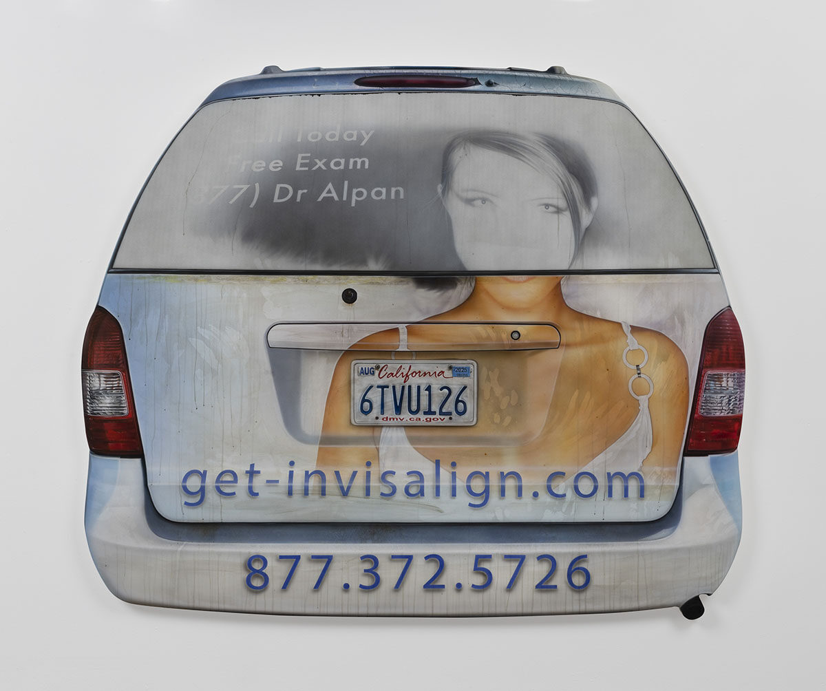 Mario Ayala was raised amid the car-centric culture in his small town west of Los Angeles. “Music album covers, skateboarding, [street] signage, and car customization” were visual markers of his childhood, he says. After studying painting and drawing at the San Francisco Art Institute, Ayala kept returning to the idea of cars as art. In his spare time, he photographed “the rear [window] of these vehicles that I would come across, whether I was back home in LA or on my commute or traveling,” he says, a process he called “research while driving.” Over the past two years, he turned this collection of photographs into Seven Vans, a series of life-size paintings of the backs of vans, now on display at the Contemporary Art Museum of Houston—Ayala’s first solo exhibition in the U.S.